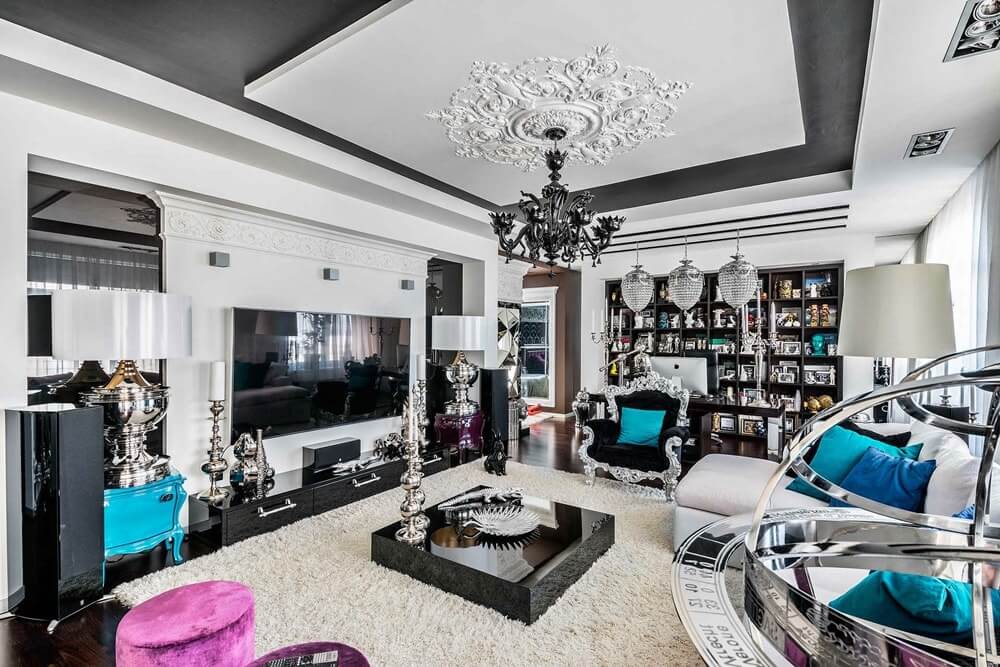Однако, лучше всего для демонстрации стиля подходит гостиная. Свободная, раскрепощенная геометрия (вертикальные поверхности перетекают в горизонтальные, ниши чередуются с выступами), орнаменты со стен, переходящие на потолок, грамотно расположенные зеркала и умелая подсветка, создающие иллюзию дополнительно пространства…
