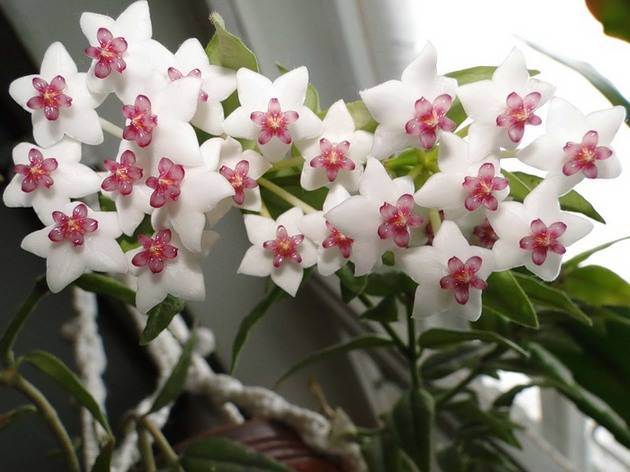 Хойя мясистая - декоративное растение из группы суккулентов. Её также называют восковым плющом или плакучей лианой благодаря капающему из цветов нектару. У растения довольно большие сочные листья овальной формы. Цветы белые, плотные, восковидные, около 1 см в диаметре.