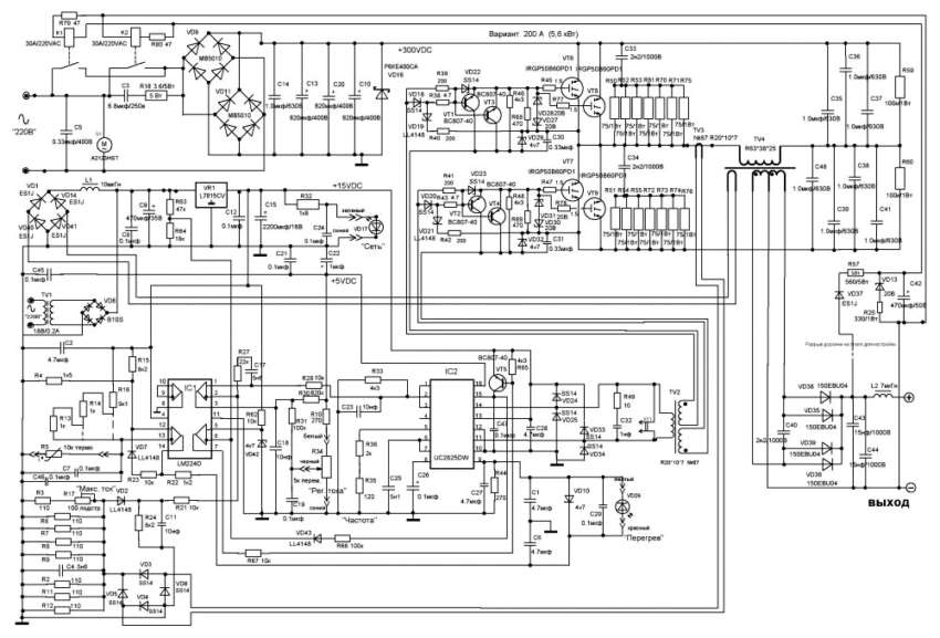 Для сравнения можно отметить, что подобная конструкция, рассчитанная на 180-200 А, весит более 20 кг. «Начинка» аналогичного аппарата инверторного типа (без корпуса, рамы и навесных частей) – не более одного килограмма.