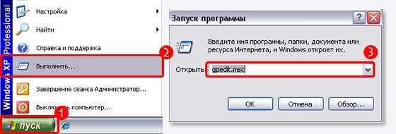Все, скорость порта мы настроили, после этого, по логике вещей, максимально возможная скорость 3G модема должна увеличиться. Далее по плану у нас настройка пропускной способности канала . Заходим в меню «Пуск» , затем «Выполнить» , вводим в командную строку gpedit.msc и нажимаем ОК .