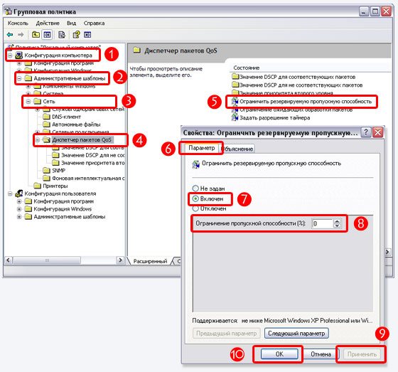 Пуск-Найти программы и файлы-пишем gpedit.msc . Открываем файл: Редактор Локальной Групповой Политики . Политика Локальный компьютер-Конфигурация компьютера-Административные шаблоны-Сеть-Планировщик пакетов QoS. Выбираем вкладку «Ограничить резервируемую пропускную способность» , открываем, в появившемся окне выбираем вкладку «Включить» (Enabled), а чуть ниже выставляем «0%». Нажимаем Применить —ОК .